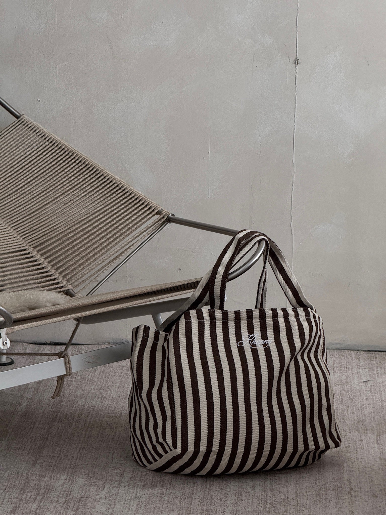 A modern essential with an old-soul feel, the Khenny Tote blends utility and style. Crafted from thick cotton canvas with bold brown-and-cream stripes, it’s made to carry everything — from market finds to weekend escapes — without losing its shape or edge. Finished with the signature Khenny embroidery. Structured yet relaxed, it’s the kind of bag that feels right no matter where you’re headed — city, beach, or somewhere in between.
